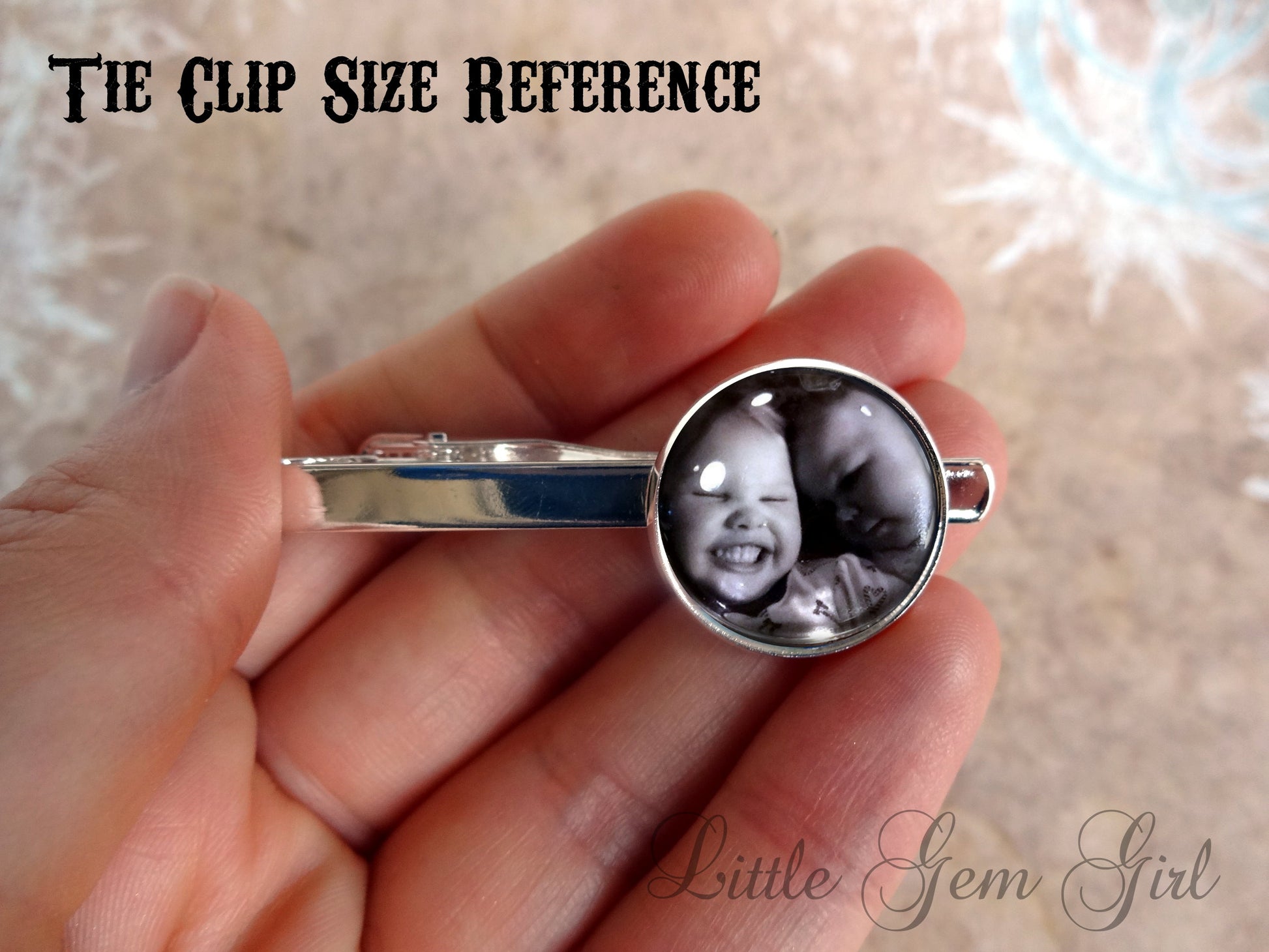 Put your favorite photo on a unique silver plated tie clip. Tie clip is approximately 2 inches in length and photo is either 18mm (.70" in diameter) or 20mm (.78" in diameter). Please see photo for size reference. High quality images are permanently fused to a thick crystal clear glass dome which gives a slightly magnified appearance that is truly lovely.
